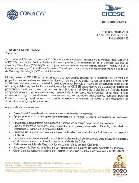 Es por ello que el Cicese, como uno de los Centros Conacyt afectados, emitió un pronunciamiento al Congreso de la Unión, en el que resalta la importancia del fideicomiso de dicho dentro de investigación y sus funciones específicas.