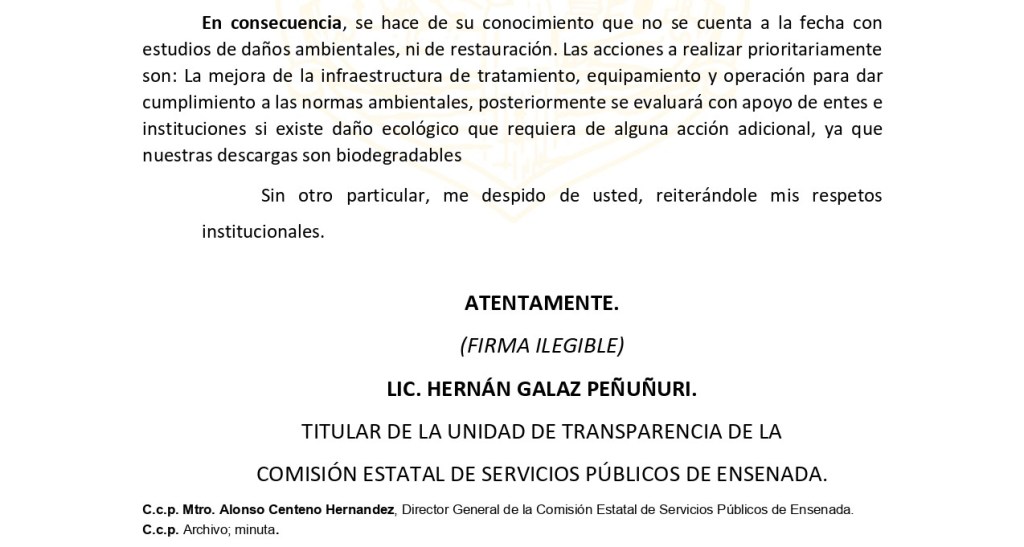 En cuanto a los potenciales daños al medio ambiente ocasionados, la Comisión Estatal de Servicios Públicos de Ensenada señaló por medio del oficio 81/2022 de la unidad de transparencia, obtenido para esta investigación, que no se cuenta a la fecha con estudios de daños ambientales, ni de restauración, y que las acciones a realizar prioritariamente son: la mejora de la infraestructura de tratamiento, equipamiento y operación para dar cumplimiento a las normas ambientales, y que posteriormente se evaluará con apoyo de entes e instituciones si existe daño ecológico que requiera de alguna acción adicional.
